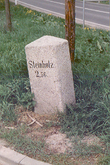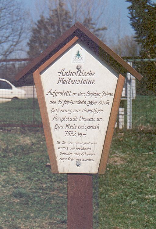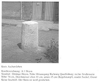 | Ich teilte meine Erkenntnisse betreffs des A 1 Hoym Herrn Schulz (Straßenmeisterei Aschersleben-Staßfurt) mit: - er hatte bereits Kenntnis von dessen Umfahren. Verursacher unbekannt. - die ungünstige Stelle an dieser Straßenecke, an welcher er seit 1996 stand, wurde vom Bürgermeister von Hoym gewählt - die Straßenmeisterei hat den ursprünglichen ! Standort dieses anhaltischen Meilensteines an Hand eines alten Fotos wiedergefunden und veranlaßt die Aufstellung an diesem alten Ort ! Ich gab den Hinweis, ihn wieder so tief einzugraben, wie er einst stand. |
