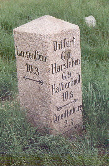 Nähe Ortsausgang Richtung Mägdesprung, etwa 100m südlich des Bahnüberganges, an der Selkebrücke (linkes Selkeufer), westliche Straßenseite Höhe: 62 cm, Durchmesser: 33,5 cm (Rundsockelstein, grauer Sandstein) Inschrift: "Meile" (Grell sah darunter noch "12,50") |