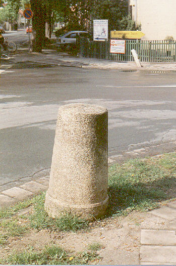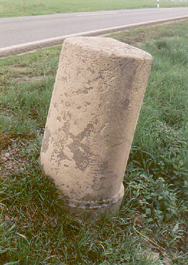 Nach Hinweis von Herrn Schulz (Straßenmeisterei Aschersleben-Staßfurt) besuchte ich ebenfalls einen Straßenstein an der B 81. Er hat die Form einer preußischen Glocke (? - bitte um Bestätigung). Standort: B 81 Abschnitt 029 km 1,6 nördlich von Egeln, 1,6km nördlich des Abzweigs nach Oschersleben, westliche Straßenseite Höhe: 100 cm, Durchmesser: 55 cm (in der Mitte gemessen) Inschriften: N: "2 Meile" S: "2 Meil" O: "4 Meile" |